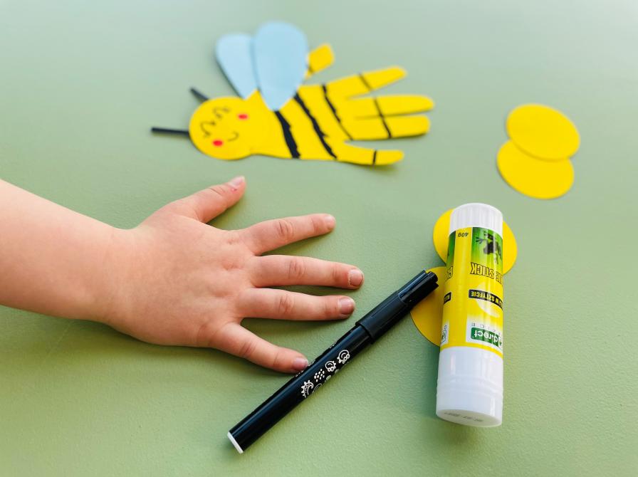 Kig ind og lav fine, stribede bier. Til denne aktivitet er den vigtigste skabelon en barnehånd – så tag dit barn eller barnebarn med, så I kan lave nogle søde bier.